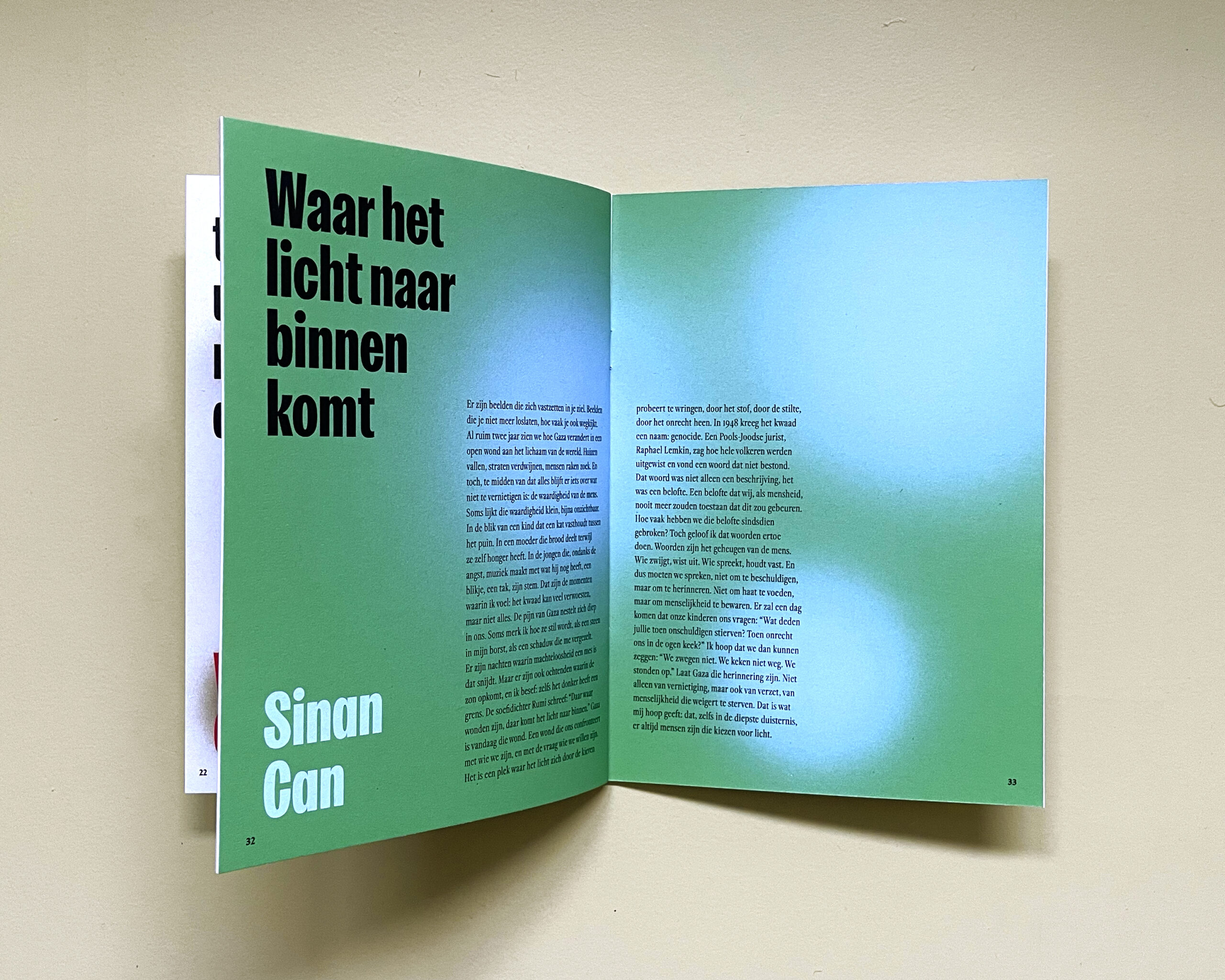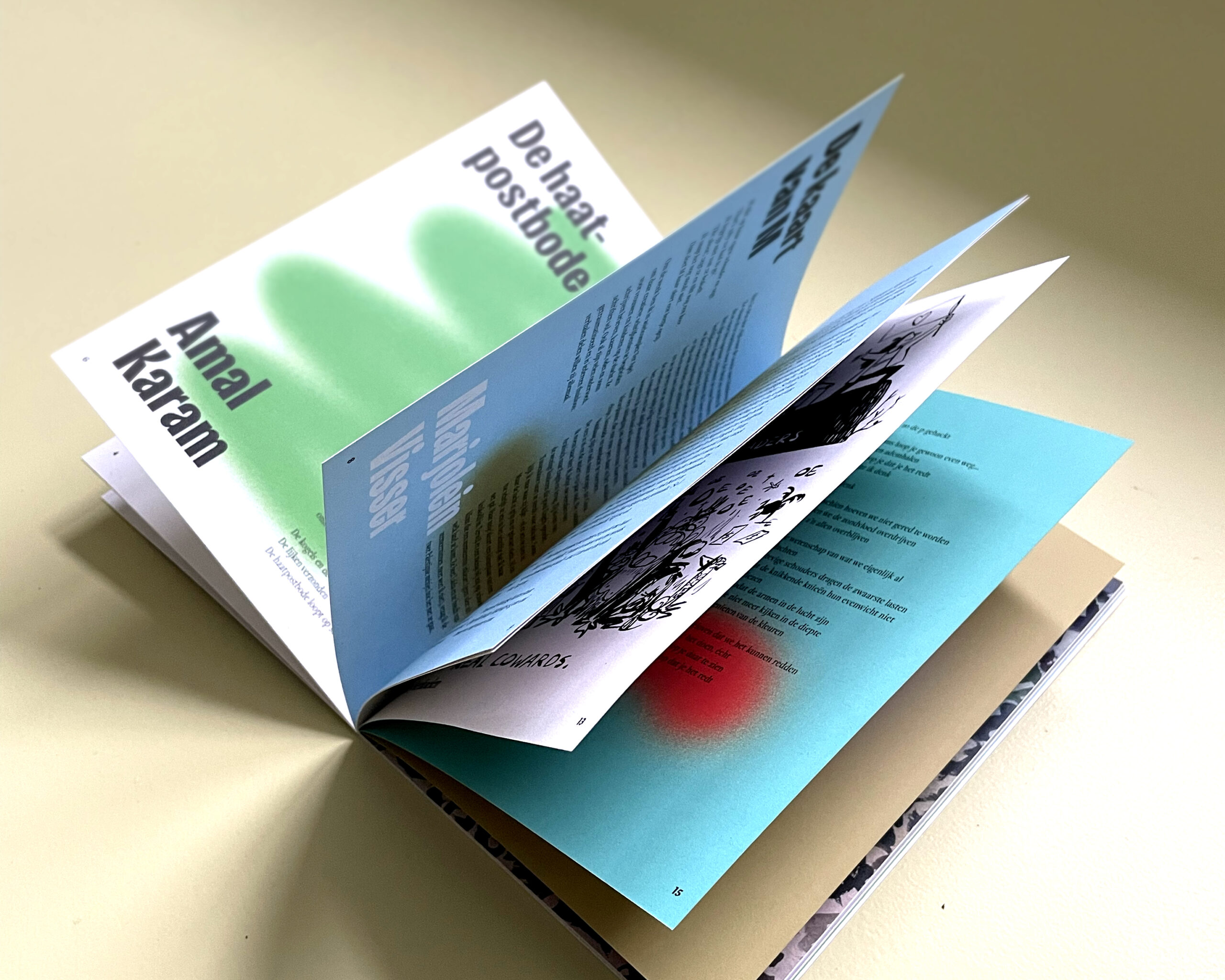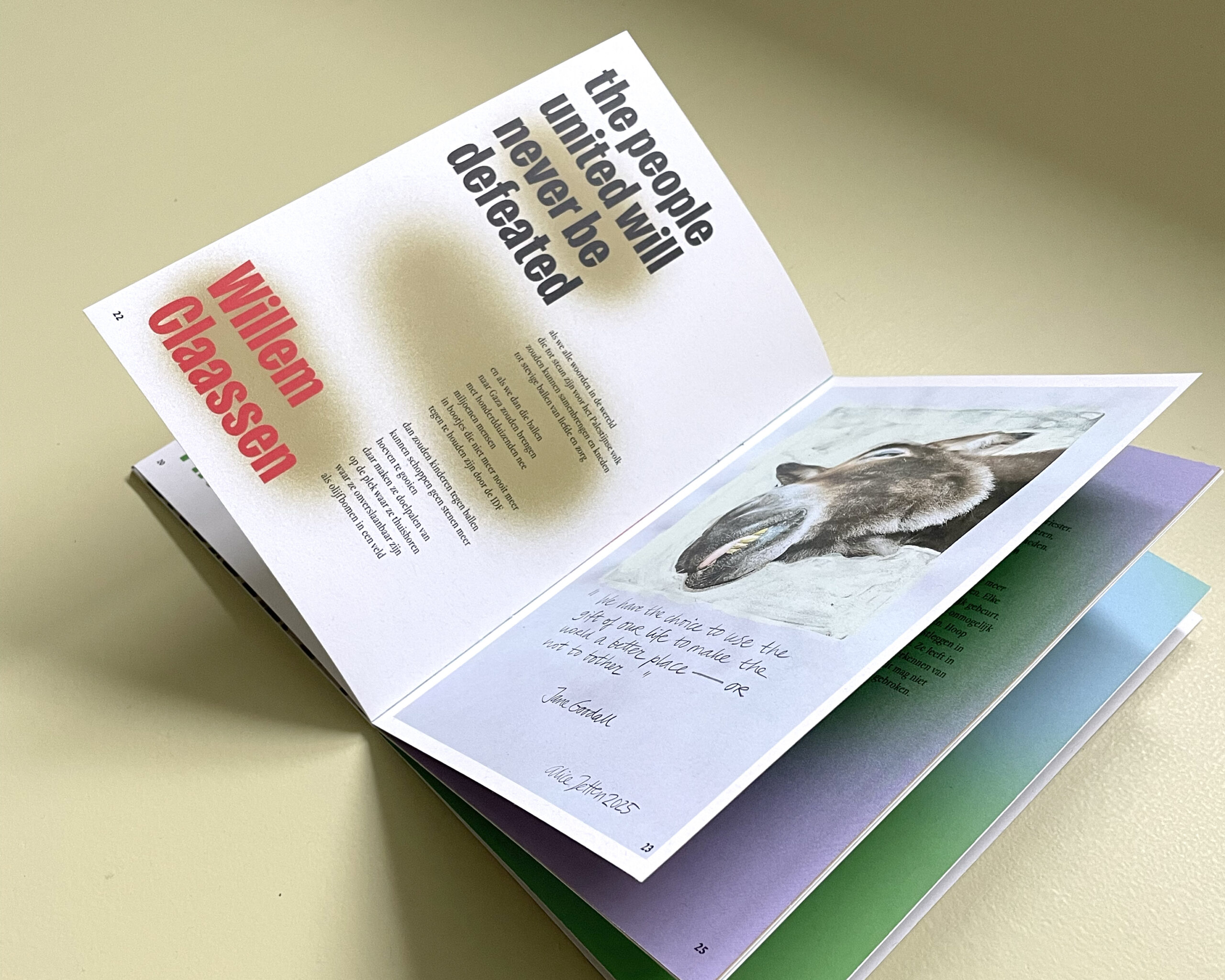 Ik mocht het binnenwerk ontwerpen voor Paleztine, een zine waarin twintig aan Nijmegen verbonden schrijvers, illustratoren en beeldend kunstenaars hun gevoel over de genocide in Palestina zichtbaar maakten of onder woorden brachten. Alle opbrengsten zijn voor Theatre Day Productions in Gaza, een organisatie die theater inzet om kinderen en jongeren een toekomst te geven.