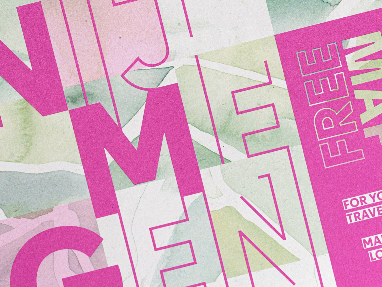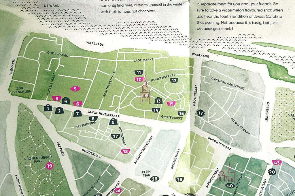 Een van de dingen die zo bijzonder is aan Nijmegen is de ligging. Waar in de stad je ook zit, in no time ben je in het groen. Dit was het uitgangspunt voor het ontwerp van de kaart. Over de zachte, groene ondergrond ligt een felle laag met alle hotspots. Zo vergeet je nooit dat je altijd even de natuur kan opzoeken tussen al het cultuur snuiven en consumeren door.